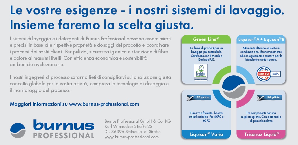 “Infine, a nome di Burnus Professional, vorrei ringraziare i nostri clienti per il loro continuo supporto e lealtà. Siamo pronti a intraprendere insieme un futuro di successo e continuare a offrire prodotti per l’igiene tessile di alta qualità e una tecnologia di erogazione moderna e affidabile e per ispirare i nostri clienti con il nostro servizio competente e personale.” •