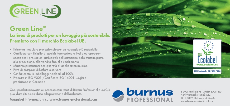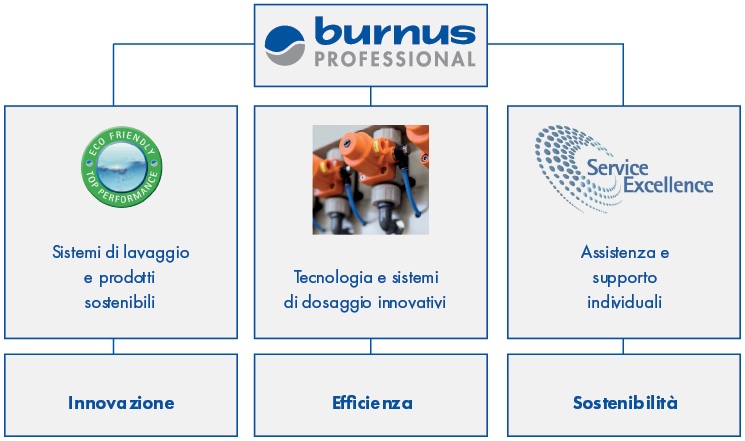 Con oltre 110 prodotti nella sua gamma, Burnus Professional offre soluzioni per tutti i tipi di lavanderia ed esigenze specifiche. L’attenzione è sempre più rivolta allo sviluppo di prodotti e processi sostenibili.