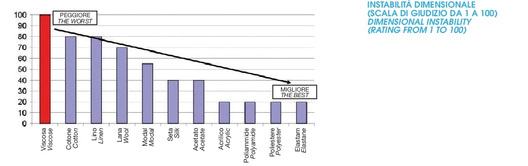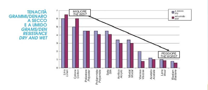 VISCOSE: the graph below shows the mechanical resistance in dry and wet cleaning conditions of various fibers. Some fibers, such as cotton and linen (very resistant) are more resistant wet rather than dry.