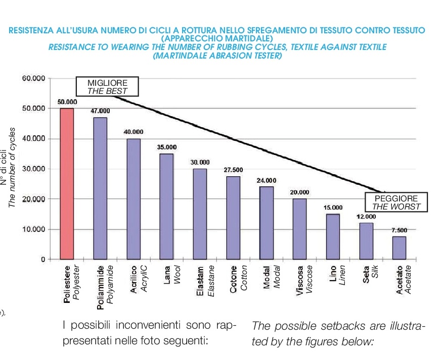 Comparing all the fibers that compose a garment, variable by variable, and keeping in mind the characteristics of each fiber, we can predict its behaviour during the use (possible defects due to the wearing of the garment that become evident after laundering) and during the maintenance, and act accordingly.