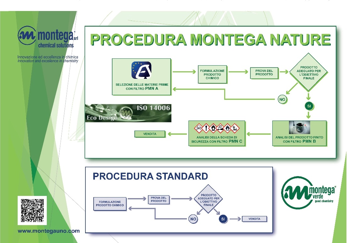 The Green line by Montega® allows for the use of a selfcontrol multilevel system placed at the start and at the end of the productive process. The elements characterizing the PMN – Procedure Montega Nature – are constituted by a filter at a base that is associated to the selection of raw materials used in formulas, and by two final filters associated to further, thorough analysis of finished products. Such filters are based on CLP classification (CLP regulation, “Classification, Labelling and Packaging”) of substances and the architecture of the raw materials used in the supplying stage.