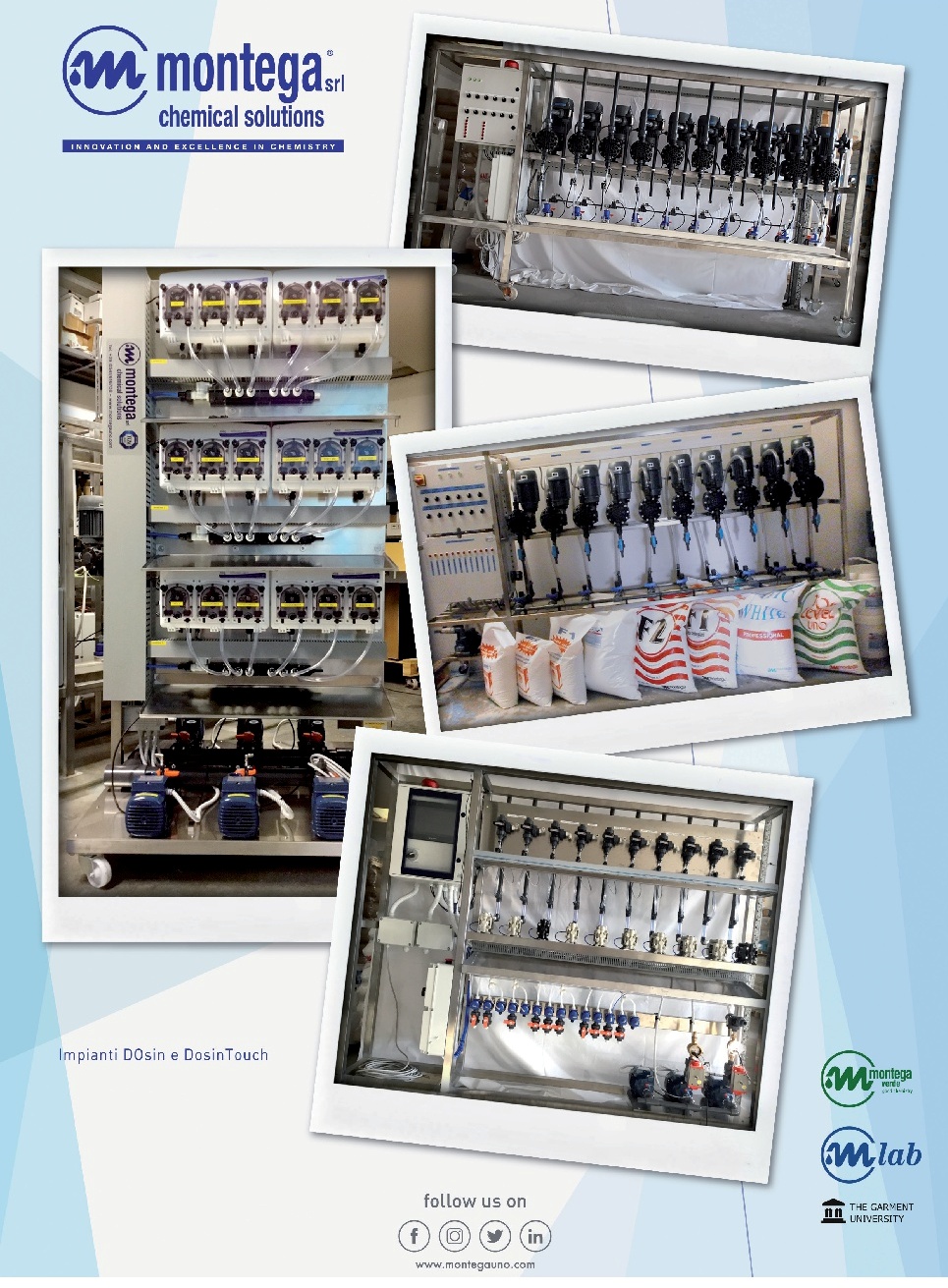 In 2018, the year of EXPOdetergo International in Milan, the exhibition of Montega® emphasized its position as a leader of the sector. As a matter of fact, the company follows its customers by producing customized wash records developed by the internal R&D Montega® lab that analyses fabrics through advanced tools. They identify both the substances that may damage the fabrics and the specific products for the removal of difficult stains. Thanks to the supply of fabric samples, the R&D Montega® realized more than 200 wash records by using EMPA 103 and EMPA 300 strips as quality and duration standards. As the business is constantly involved in searching for new solutions that combine the highest possible washing standards with the necessity of protecting the environment we live in, Montega has realized a new, automated system called DOSITOUCH.