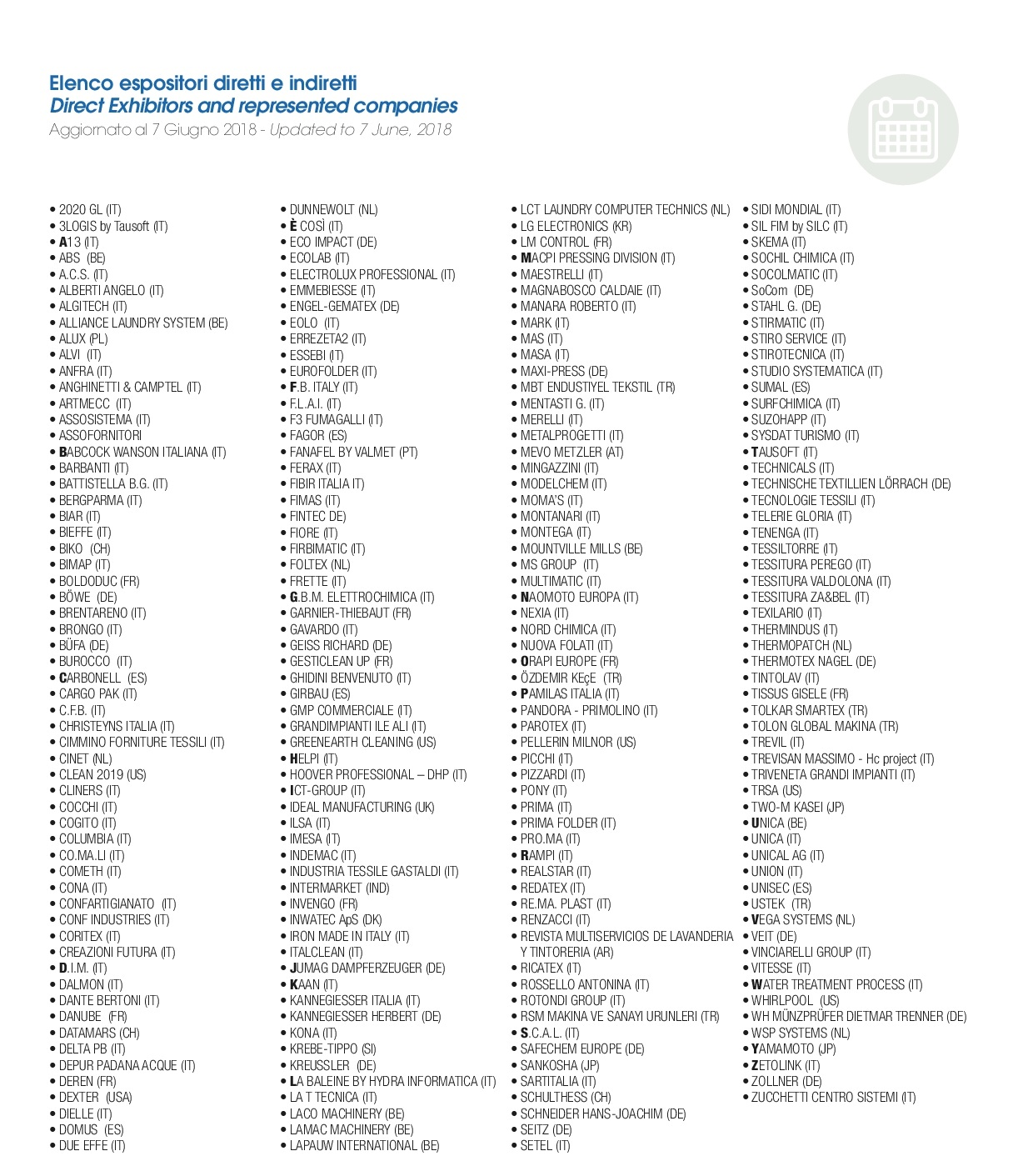 These are the impressions of Detergo readers every month, when they go to the exhibitors page with the names listed in an alphabetical order. During EXPOdetergo International 2018, the brands will exhibit a wide range of machines, products and services for laundries from 19 to 22 October at Fiera di Milano/Rho.