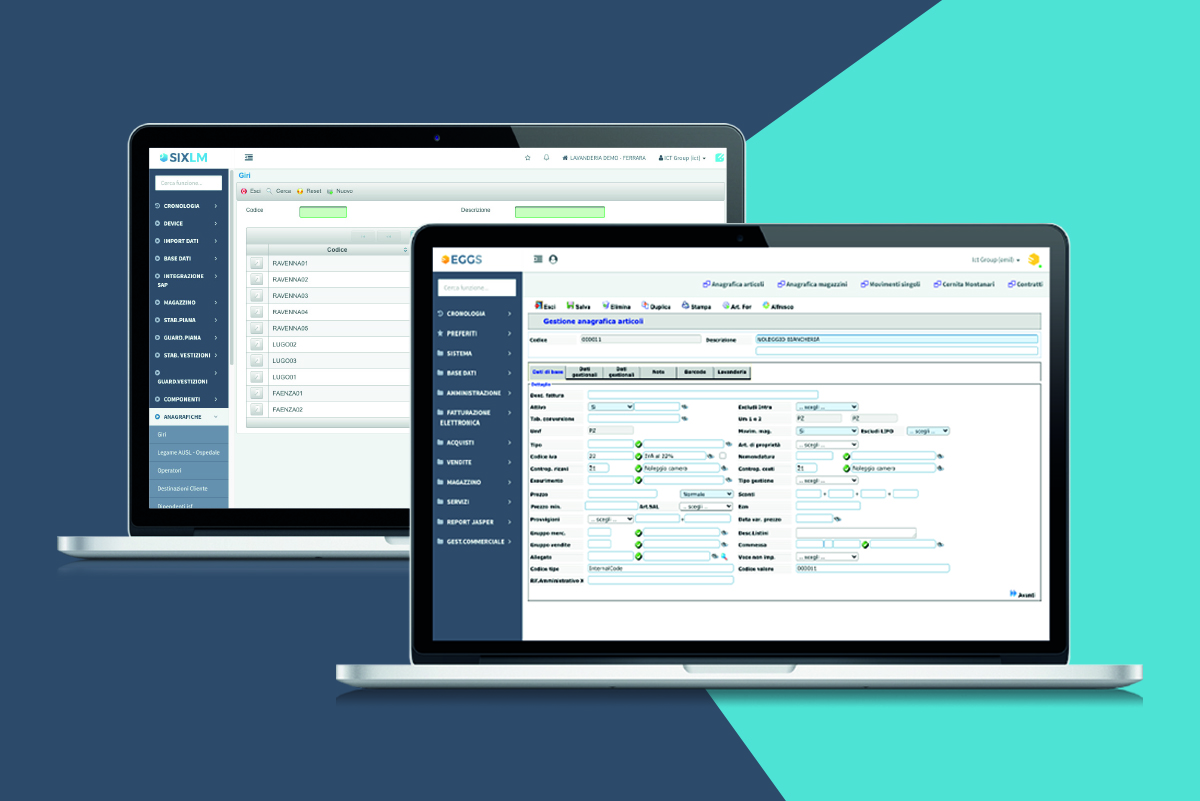 Both EGGS Laundry and SIXLM are modular tools. They can be configured and their parameters can be set on the basis of any specific necessities the plant presents, which allows to manage more production sites. Both systems are provided with necessary modules for a quick and efficient handling of every business aspect, from administration to production, from maintenance to warehouse. If necessary, the systems can also be perfectly integrated with any device or software that is already in use.
