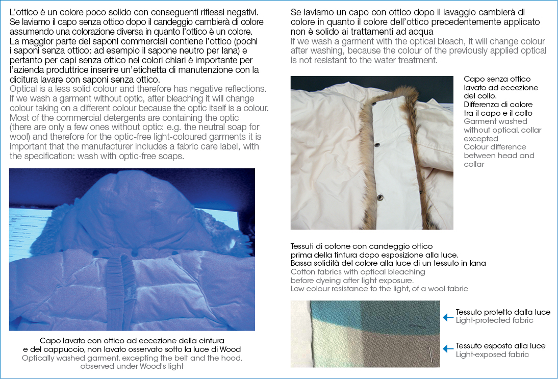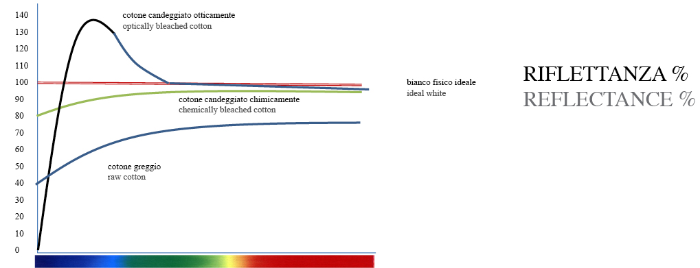 Come si rileva nella figura, fatta cento la riflettenza ottimale del bianco, il cotone presenta una riflettenza del 70-75% a causa delle impurezze presenti per cui a seguito del candeggio il tessuto ha ancora una tonalità gialla. Lo stesso vale per la lana che a causa della maggior quantità di impurezza, dopo il lavaggio risulta ancora più gialla rispetto al cotone. Nel caso della lana, lino o cotone, per migliorare il bianco è necessario usare l’ottico con una riflettenza al 100% e con picchi al 140% tendente all’area del blu (della figura).