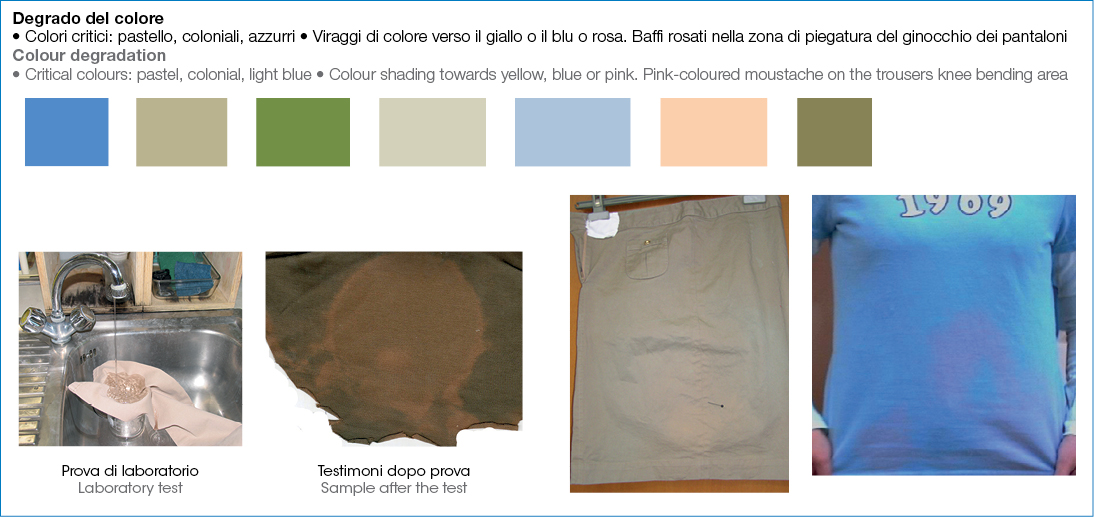 Il difetto interessa alcuni colori particolari quali gli azzurri, i blu, i colori pastello e i colori coloniali. Non esistono normative di prova. Il degrado viene espresso mediante la scala dei grigi con valori da 1 pessimo a 5 ottimo. Gli stilisti e le aziende per vendere ed emozionare i clienti creano colori brillanti e vivacissimi, agendo sul candeggio ottico prima della tintura. Questa prassi è però spesso: dannosa per l’ambiente e pericolosa per la salute. Dannosa perché riduce le solidità dei colori – ai vari fattori di esposizione del capo durante la vita – e la manutenzione in modo consistente.