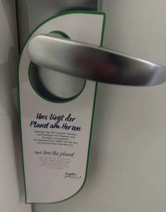Una di queste è l’introduzione del pendaglio o cartello retro-porta “No room cleaning“: l’idea alla base è semplice ma estremamente efficace: gli ospiti, se desiderano, possono rinunciare alla pulizia giornaliera delle camere e alla sostituzione del corredo bagno (asciugamani, accappatoi, tappeti doccia, etc.), ottenendo in cambio uno sconto sul soggiorno, una colazione gratuita, delle consumazioni gratuite aggiuntive, un aperitivo o altri van- taggi. Secondo una ricerca condotta dalla Queensland University, il 42% degli ospiti è incline a rinunciare alla pulizia giornaliera se viene incentivato con una colazione o un aperitivo gratuito, mentre solo l’8% accetta questa opzione se viene semplicemente informato dei benefici ambientali.