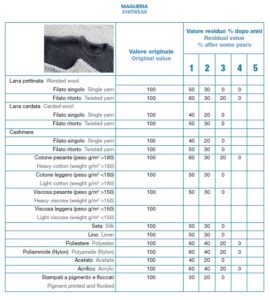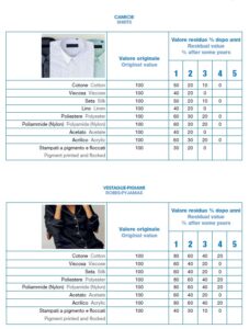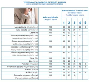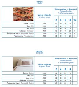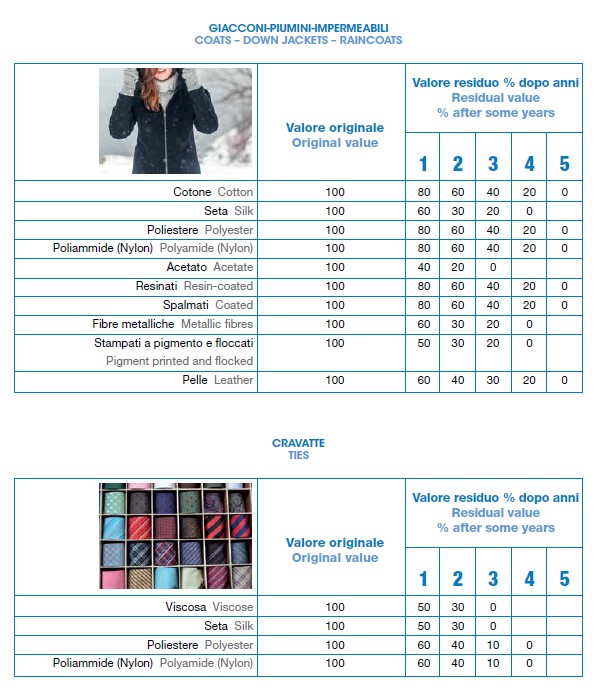 Per valutare correttamente il valore residuo dei capi d’abbigliamento o degli articoli tessili d’arredamento, li abbiamo suddivisi per classi di articolo e per composizione, tenendo conto da un lato delle sollecitazioni cui essi sono sottoposti durante l’uso e la manutenzione (ad esempio divano, tenda, maglia, cappotto, impermeabile, vestito, ecc) e dall’altro delle proprietà delle singole fibre (lana, seta, poliestere, fibra metallica, ecc.), che presentano valori di residenza differenziati ai vari fattori di alterazione cui sono sottoposte durante l’utilizzo dei capi e articoli tessili. Il tempo di vita dei capi si misura a partire dalla data di vendita del negozio al cliente e non dalla data di produzione della ditta costruttrice.