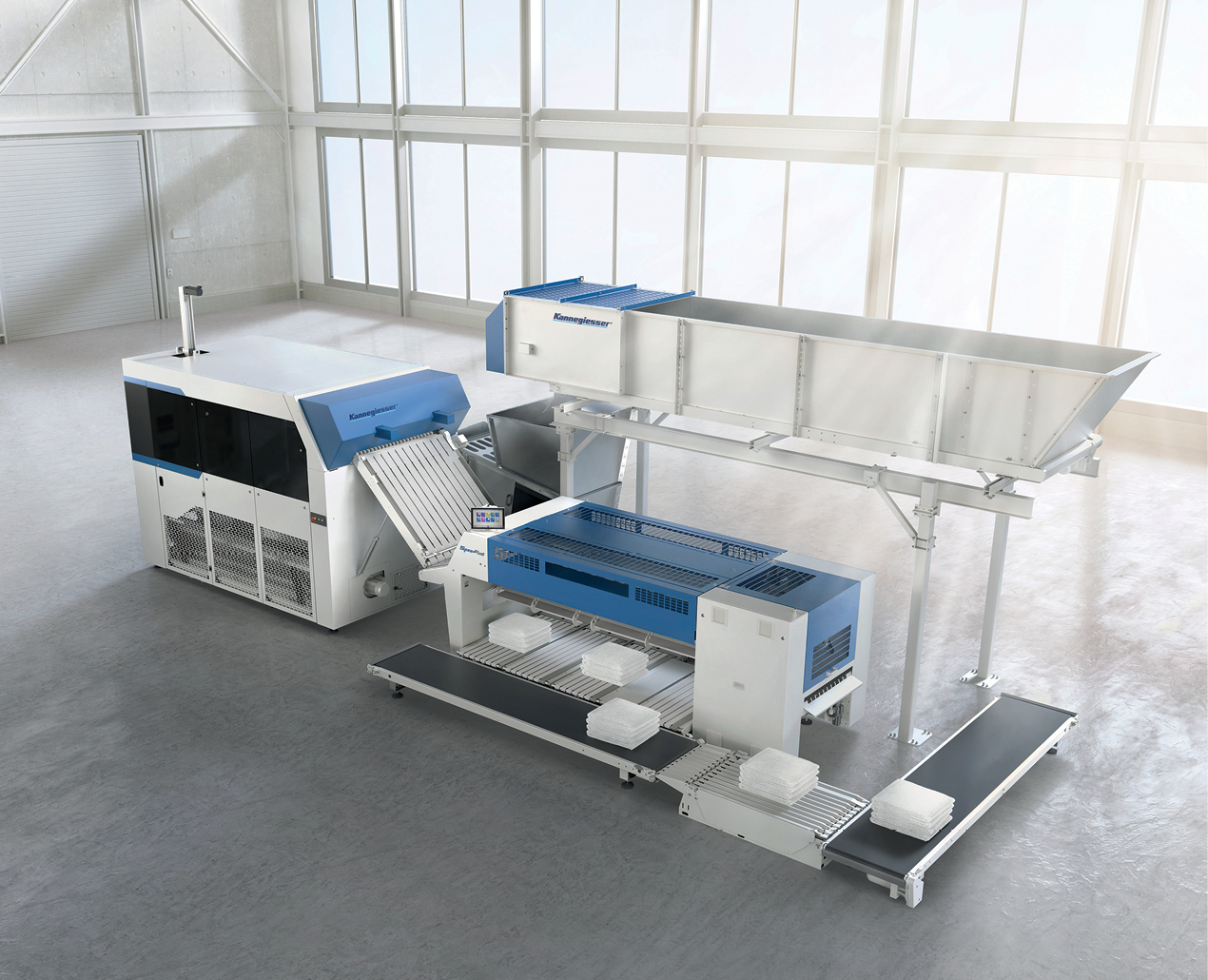 Nel progettare la linea di lavorazione della biancheria asciutta robotizzata Robofeed, Kannegiesser ha posto l’accento sulla perfetta integrazione nella logistica della lavanderia. Il sistema consente ai servizi tessili di automatizzare l’intero processo di lavanderia tra la selezione della biancheria sporca e la spedizione: le spugne vengono lavate e asciugate automaticamente utilizzando programmi di lavorazione ottimali registrati nella banca dati. Un sistema di smistamento e stoccaggio post-lavaggio consegna la biancheria alla linea di asciugatura Robofeed, in grado di alimentare, piegare, smistare e impilare automaticamente lotti misti provenienti da hotel e ospedali. Il sistema è composto dal robot di alimentazione Robofeed, che è stato sviluppato di recente e approvato sul campo, e dalla piegatrice Speedline XFM.