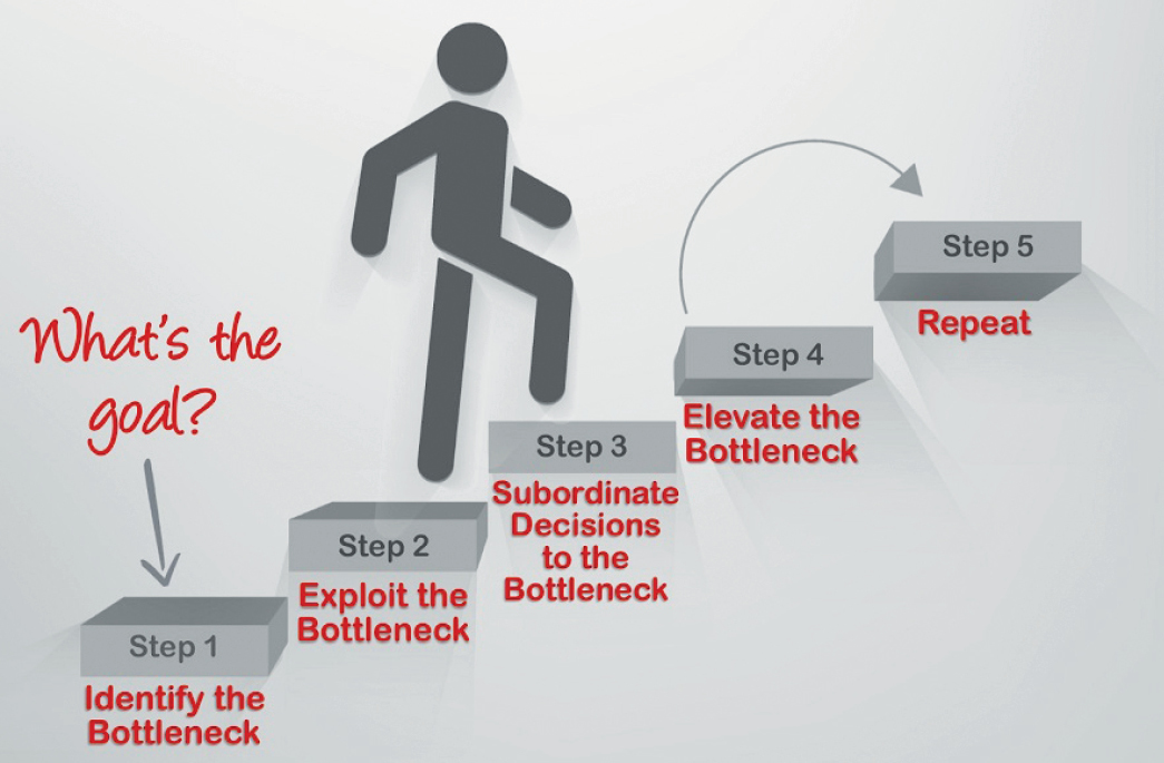 La teoria dei vincoli fu sviluppata dal guru del management israeliano Eliyahu Goldratt e introdotta nel libro “L’obiettivo” (1984). Si basa sul principio che il compito più importante di un’azienda (e perfino di una no profit) è ottenere un profitto. Goldratt considerava ogni impresa come un sistema, o una catena, di attività, il cui successo si misura in base a tre parametri: le scorte (inventory), i fondi investiti nell’organizzazione; le spese operative (operating expenses), i fondi usati per convertire le scorte in vendite; il throughput, il flusso di denaro entrante. Ogni sistema ha almeno un “vincolo” o anello debole che, se viene rintracciato e superato (o controllato, se è inevitabile), favorirà il raggiungimento degli obiettivi. Il segreto è focalizzarsi sul fattore limitante più significativo, poiché la sua gestione produrrà il maggior beneficio per l’intero sistema. Per esempio, mantenere basse le spese operative può accrescere l’efficienza del dipartimento, ma giova all’organizzazione solo se incrementa anche il throughput. I cinque passi della focalizzazione aiutano un’organizzazione ad aggirare o perfino a superare i vincoli più significativi.